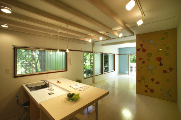 ●階段を設け、リビングと段差を15cm作る事でキッチン側は天板まで85cmでありながら、テーブル高さは70cmにする事に出来ました。