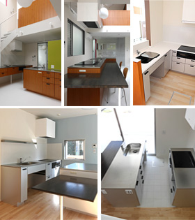 Aタイプ101、102、201、202号室は調理台と流しがコンロ部分から独立した広いスペースです(写真左上)。103、203号室はまるでお店のカウンターのようなつくり(写真上部中央)。