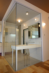 ガラス張りの引き戸が住居スペースとの境界になっており、水周りをコンパクトにまとめ、部屋の仕切りは設置されているカーテンレールで自由にデザインできる1Rのスタジオタイプです。
