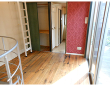 赤い壁紙が印象的な2階はバルコニーの大きなサッシと、ロフトへ続く高い天井が開放感を。