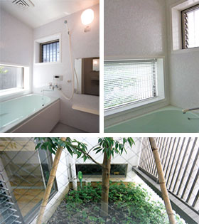 追焚き機能付きのユニットバス。 Aタイプのバスルームからは隣接する坪庭(ライトコート)が、お湯につかりながら眺められます。自然の風情を感じられる要素が凝縮された、この僅かな空間が、ゆったりとくつろぎの時間を演出してくれます。